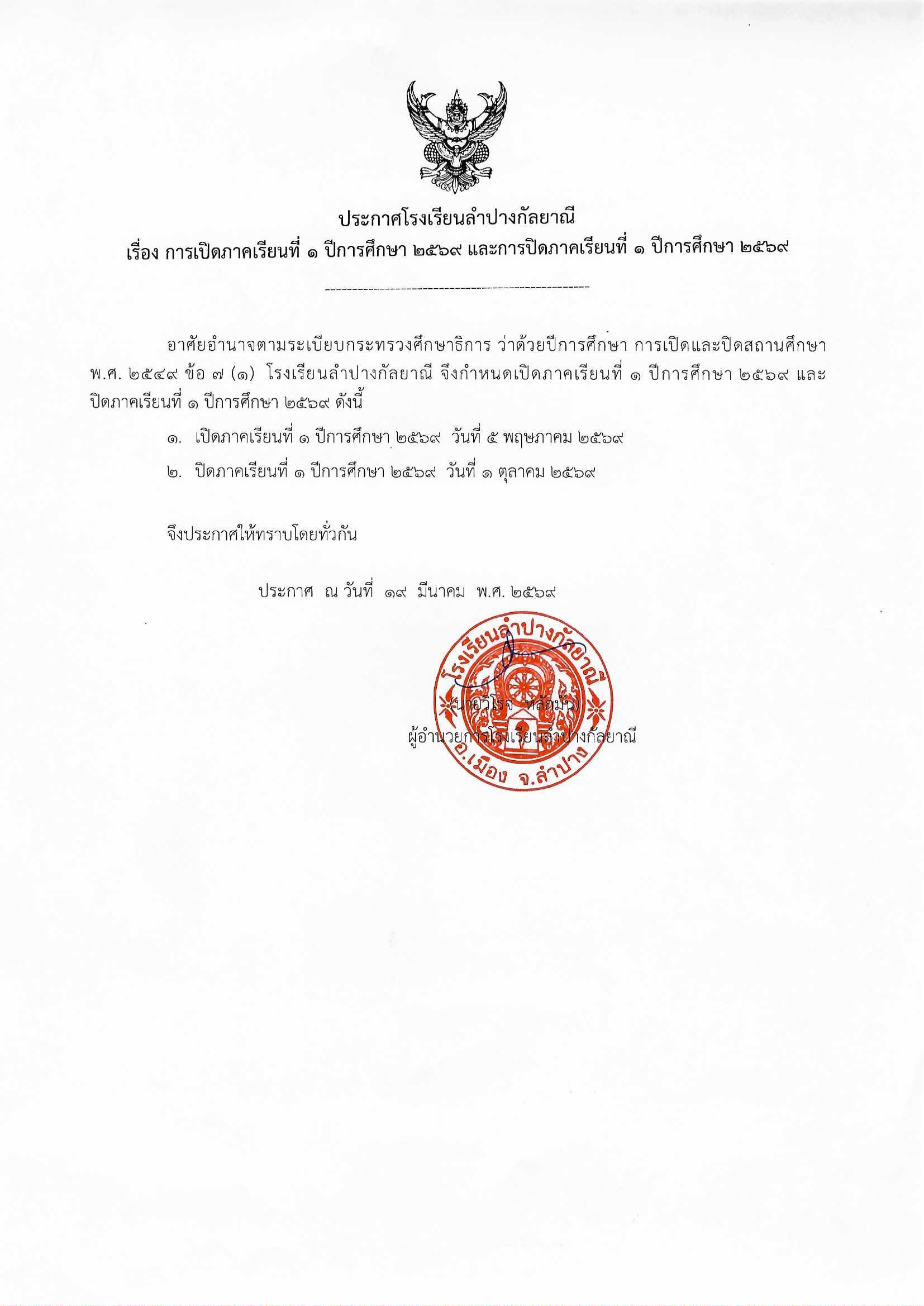 ðŸ”ĩāļ›āļĢāļ°āļāļēāļĻāđ‚āļĢāļ‡āđ€āļĢāļĩāļĒāļ™āļĨāļģāļ›āļēāļ‡āļāļąāļĨāļĒāļēāļ“āļĩ āđ€āļĢāļ·āđˆāļ­āļ‡ āļāļēāļĢāđ€āļ›āļīāļ”āļ āļēāļ„āđ€āļĢāļĩāļĒāļ™āļ—āļĩāđˆ 1 āļ›āļĩāļāļēāļĢāļĻāļķāļāļĐāļē 2569 āđāļĨāļ°āļāļēāļĢāļ›āļīāļ”āļ āļēāļ„āđ€āļĢāļĩāļĒāļ™āļ—āļĩāđˆ 1 āļ›āļĩāļāļēāļĢāļĻāļķāļāļĐāļē 2569